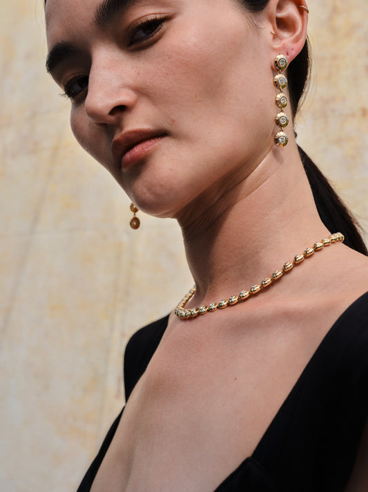 SARARA 5 DROP EARRINGS - MANDARIN GARNET, UNHEATED TEAL SAPPHIRE, AND MALAYA GARNET