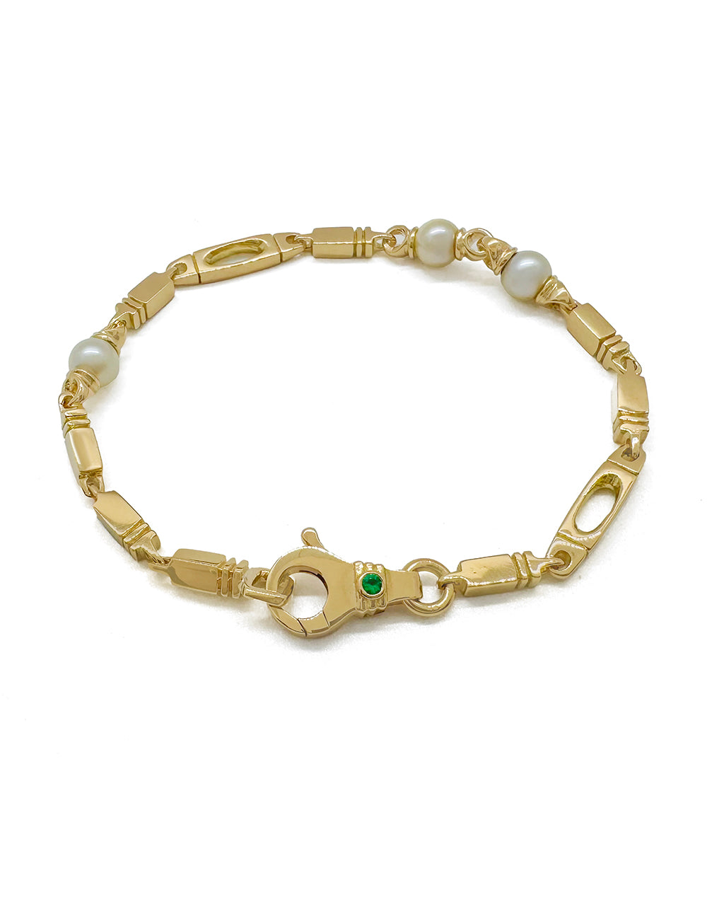The Addai Pearl Bracelet has a sturdy design. Placed delicately around the design are Japanese Akoya pearls, symbolizing femininity and peace.