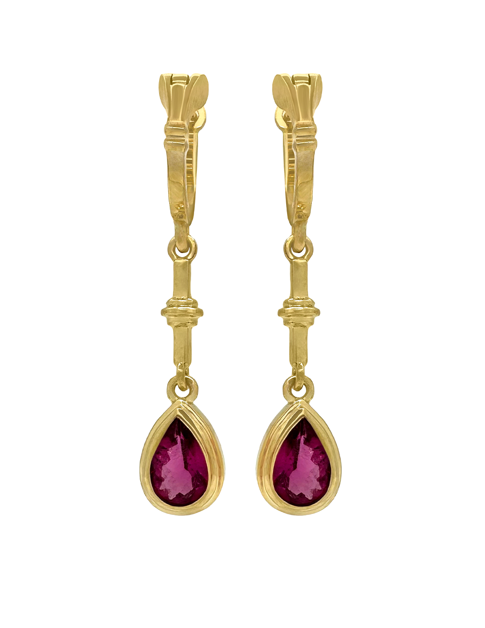 The Avi Pear Drop Earrings are an elegant addition to any jewelry collection. They are classic and timeless in design, featuring two gorgeous pink Tourmaline stones.