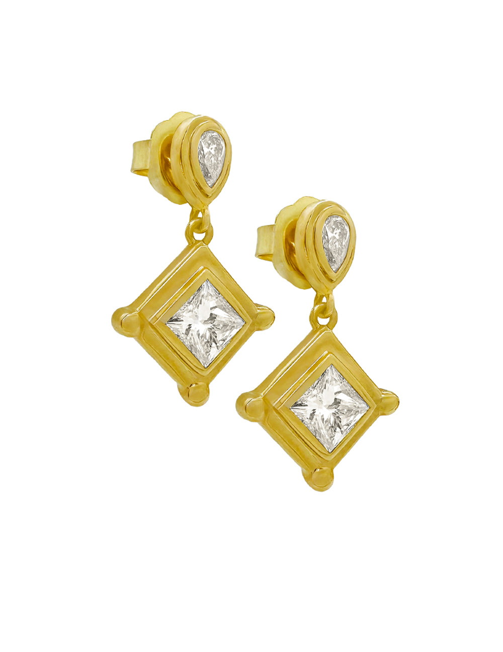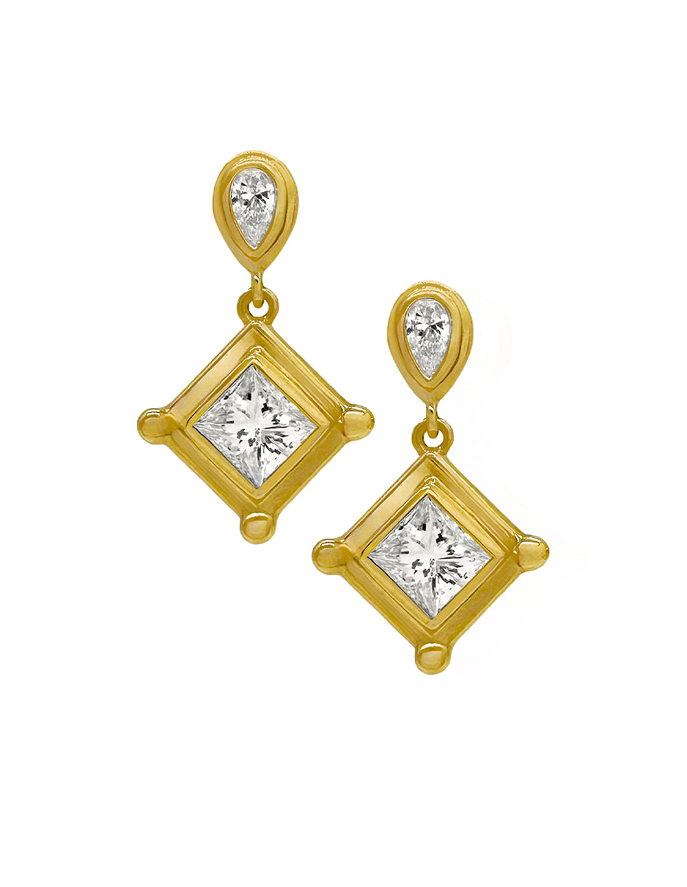 The Belle Diamond Earrings are elegant in design featuring two square cut Diamonds, displayed in a diamond shape, and two teardrop Diamonds. These intricate earrings were casted and crafted in Los Angeles.