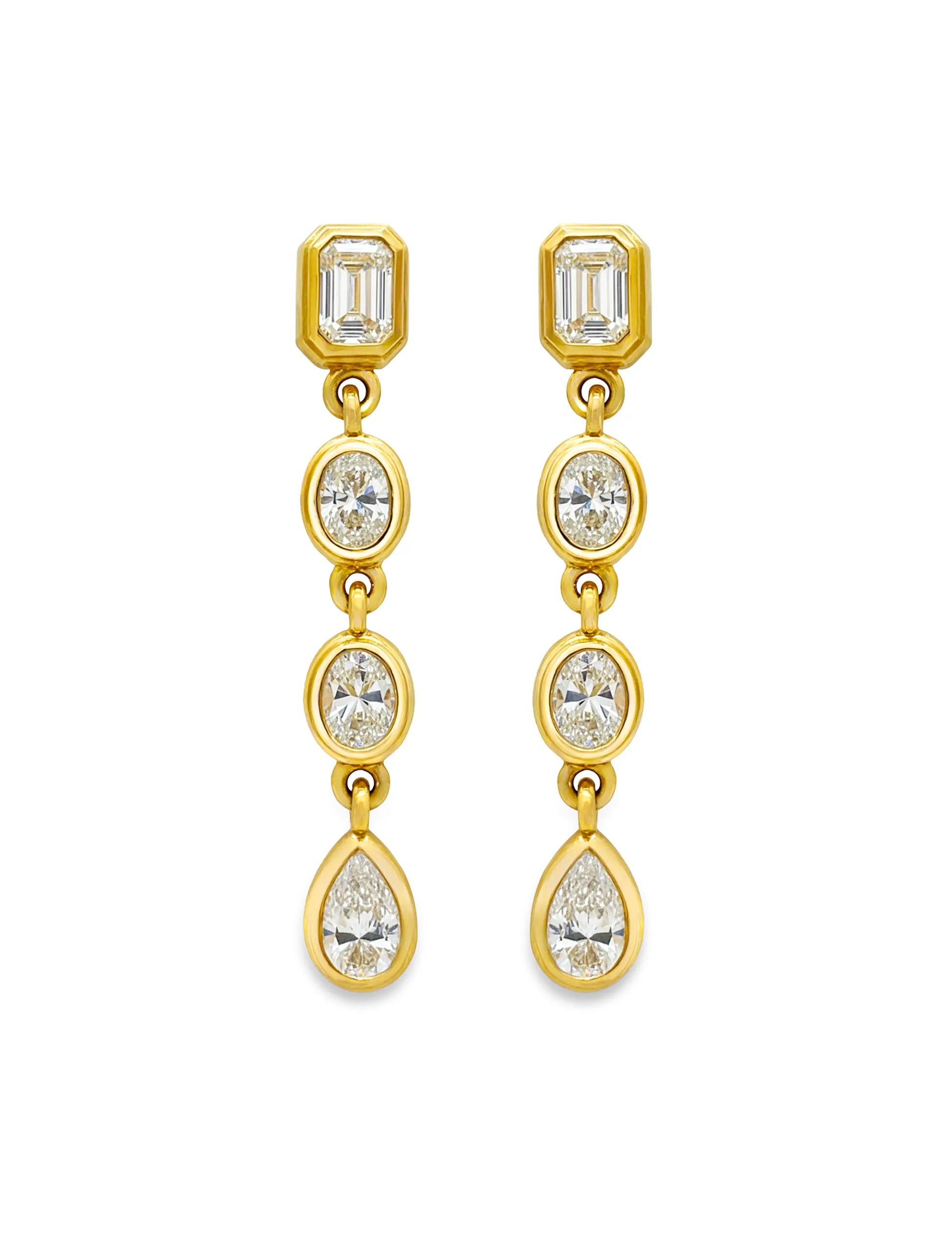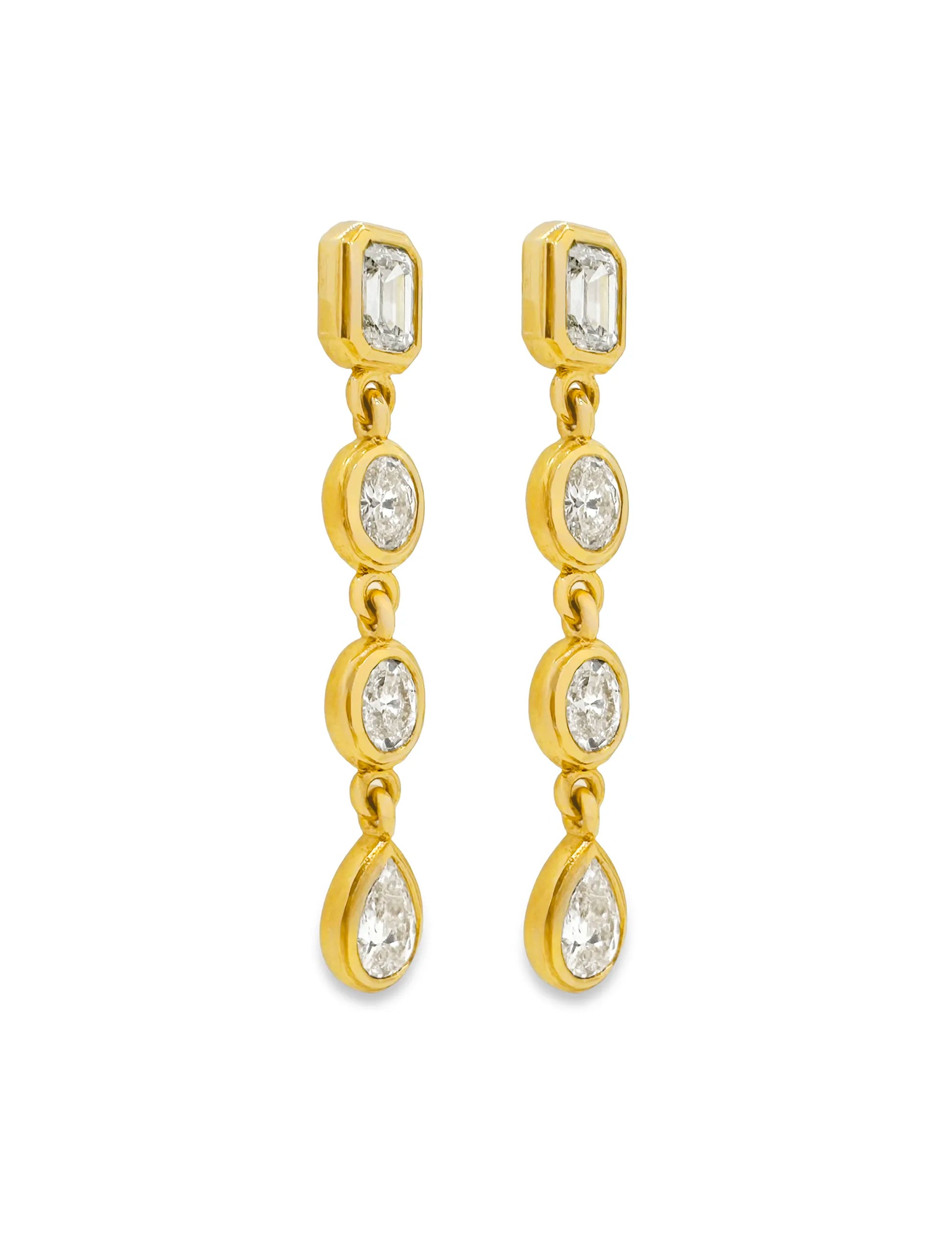 The Cascade Diamond Drop Earrings move with light and purpose. Four articulated diamond drops cascade down from the ear, each element is bezel set into polished 18KT Gold, creating a structured yet fluid silhouette. Handcrafted in Los Angeles, these earrings are delicate in scale but striking in presence.