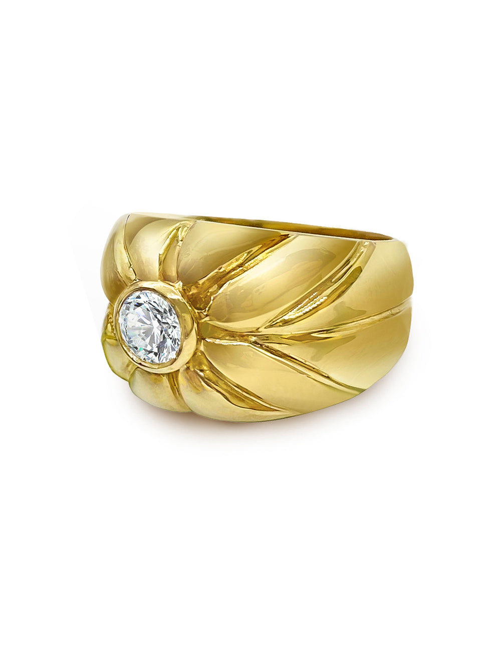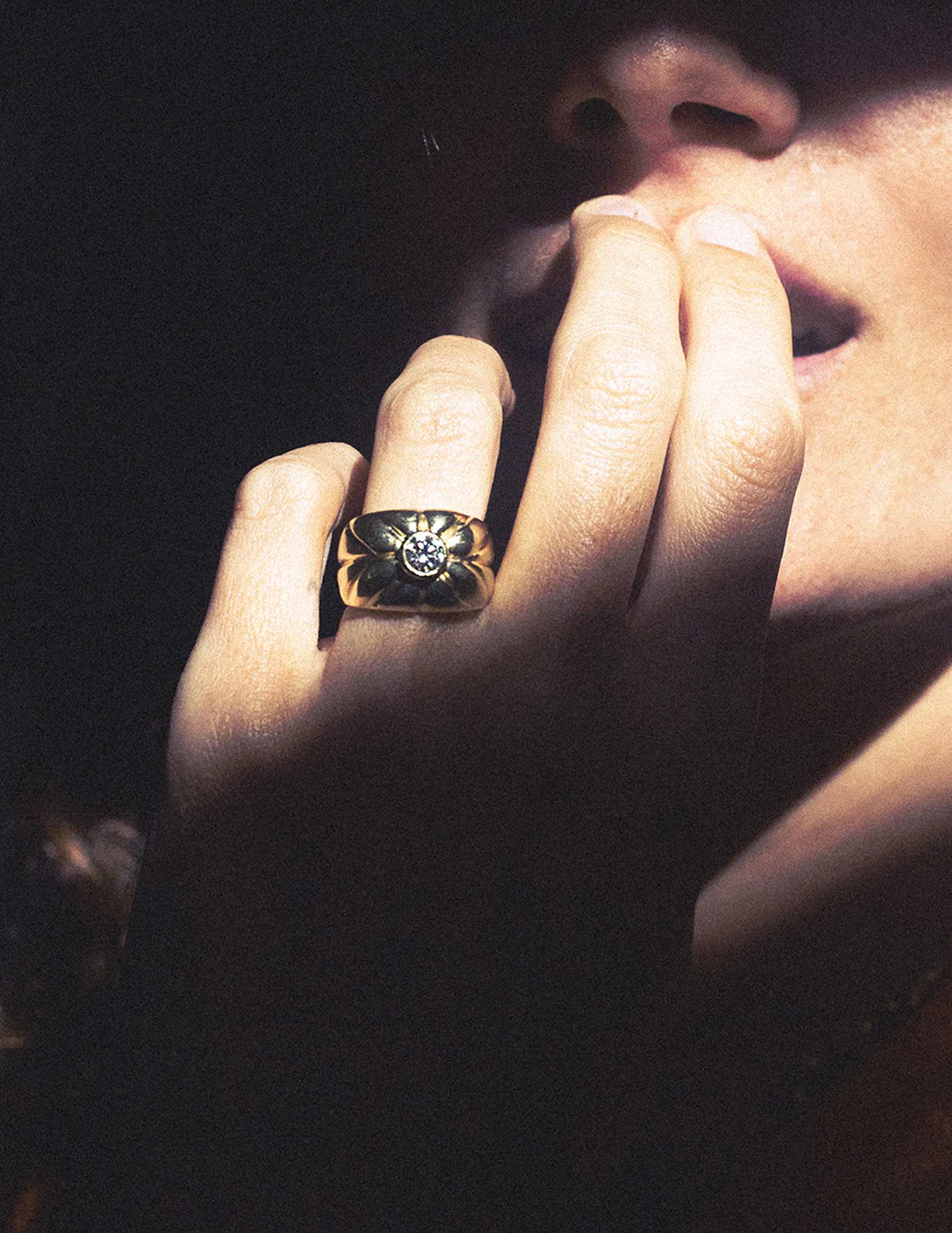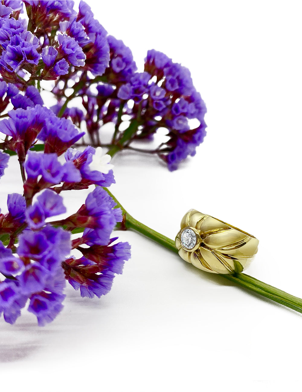 The Diamond Flower Ring showcases a dazzling round Diamond, nestled in a large, organic band.