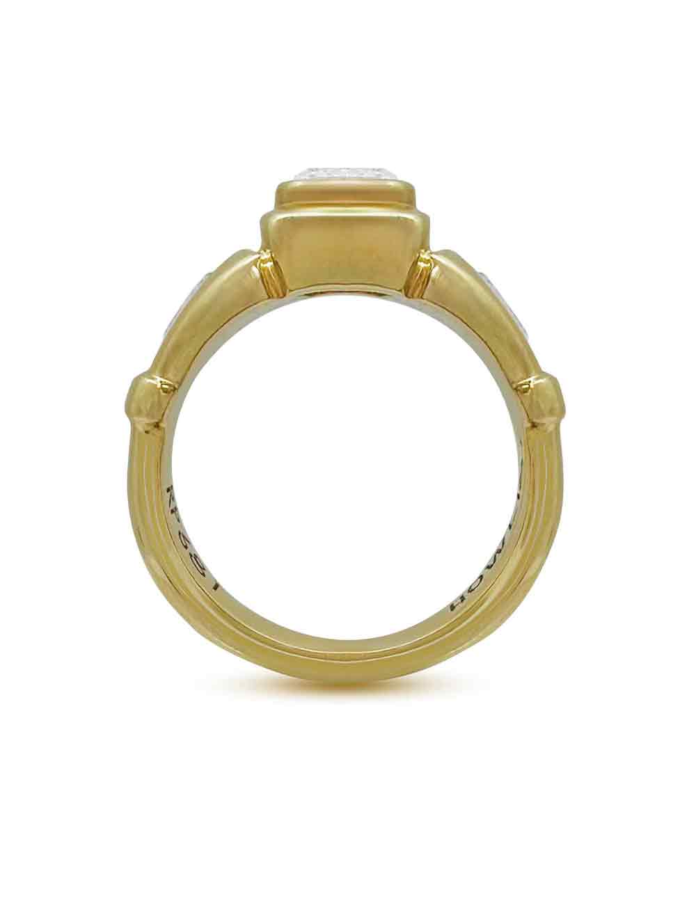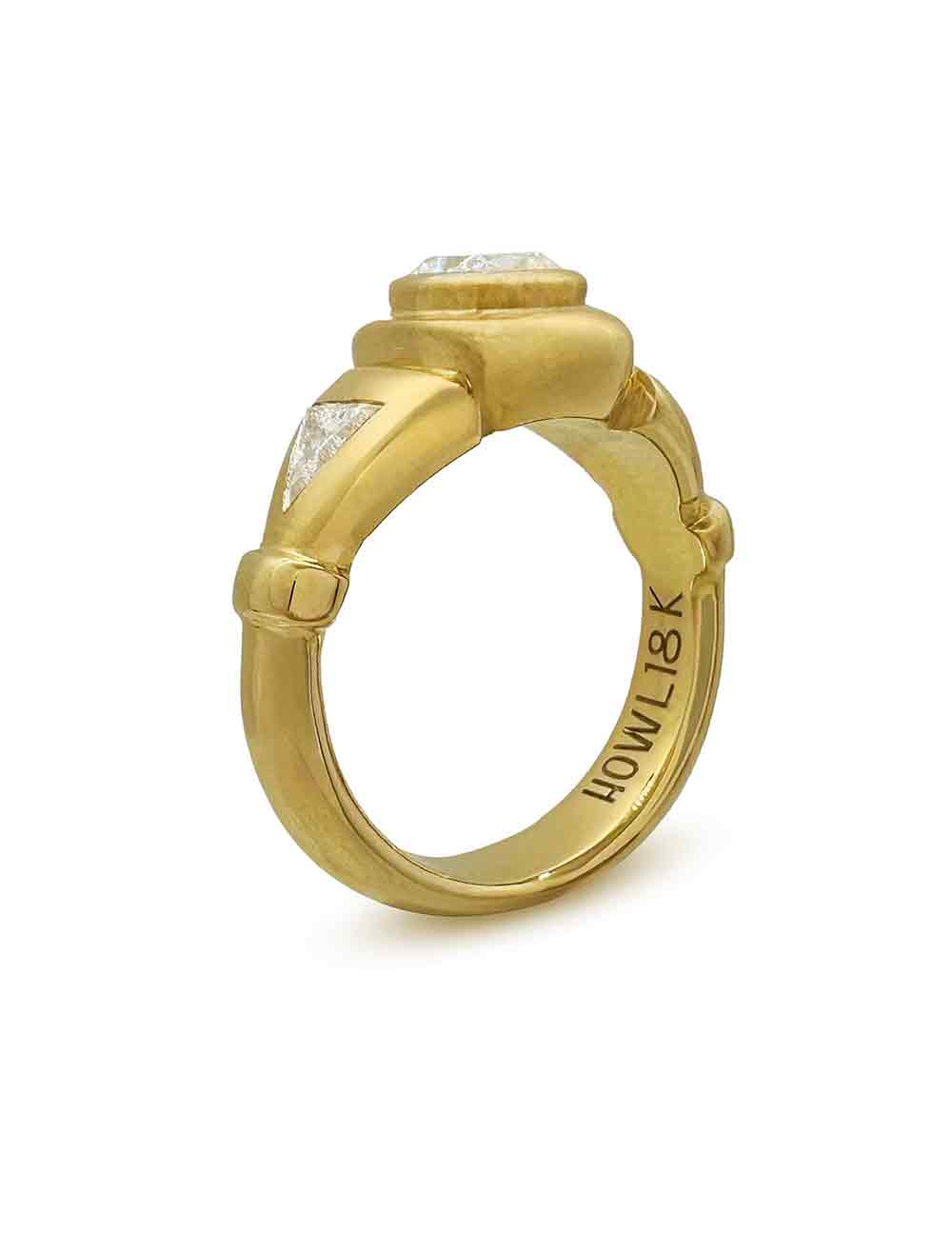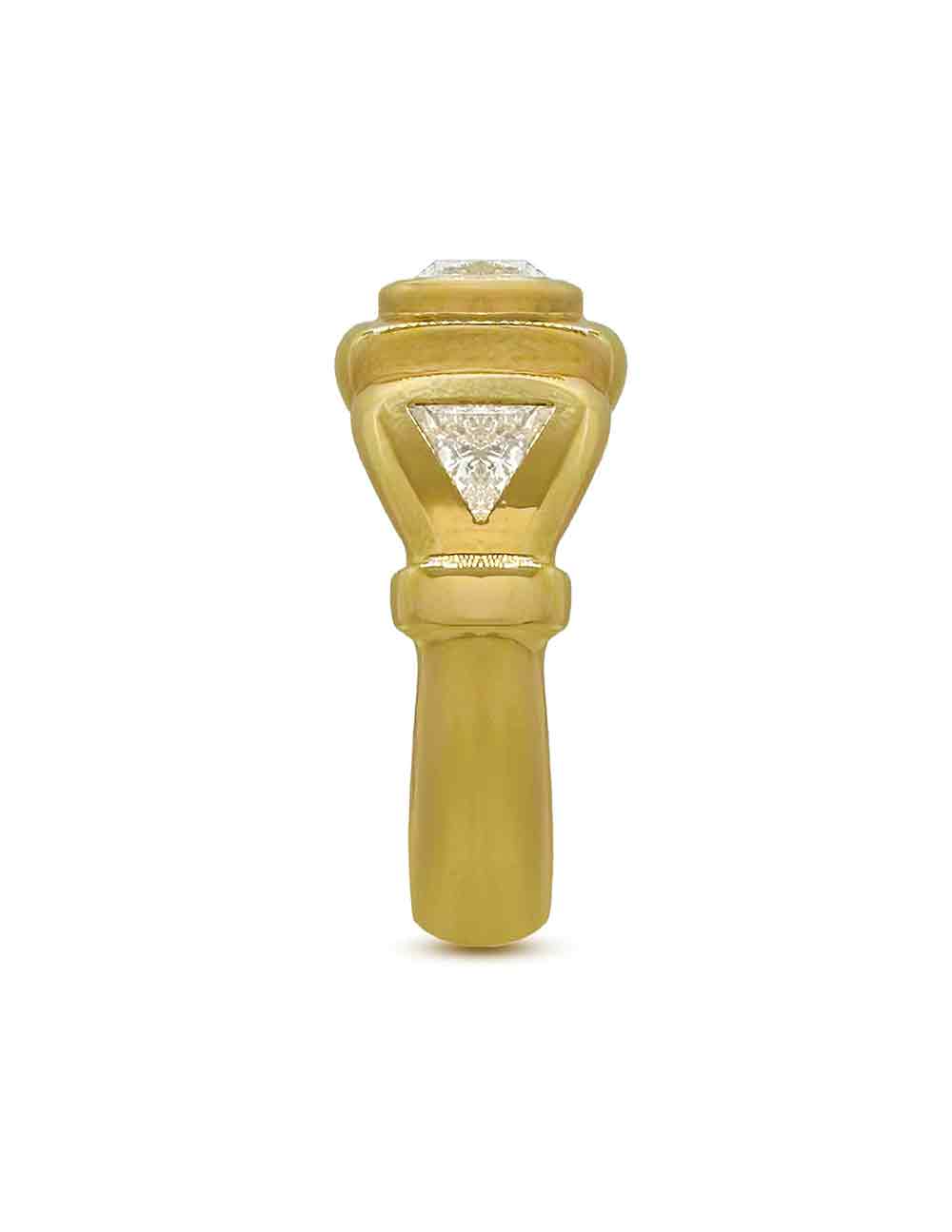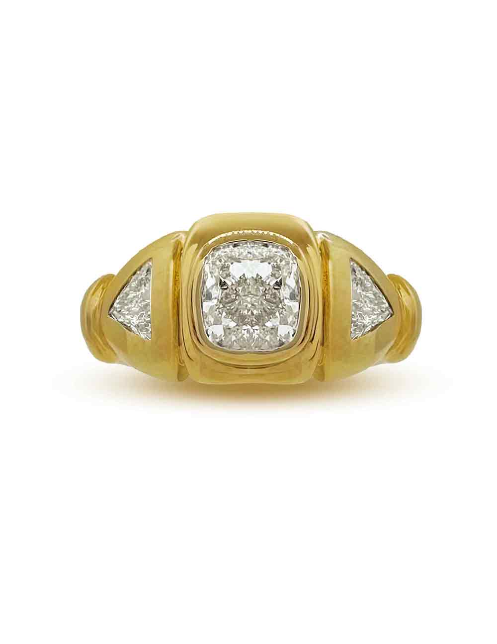 The Ellie Diamond Ring features an intricately carved band in the Art Deco style. This design showcases a dazzling, 1ct cushion-cut Diamond right in the middle of the ring and a pair of triangle Diamonds on either side.