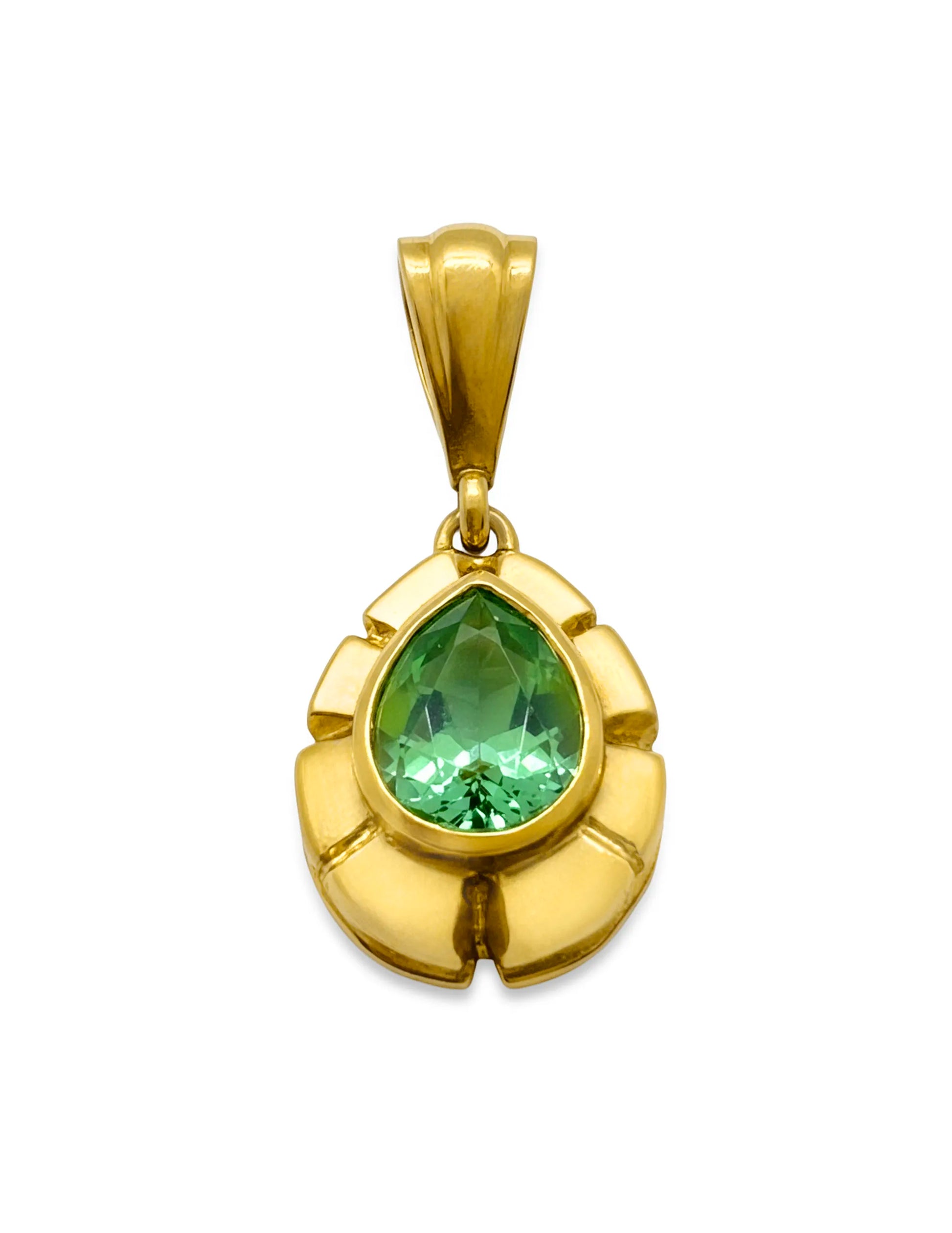 The Elliot Paraiba Pendant exudes an aura of regality while still being contemporary. The feature is a pear-shaped Paraiba Tourmaline, its luminous green hue framed by a sculptural 18k yellow gold setting. The elegant design is a modern tribute to timeless beauty.