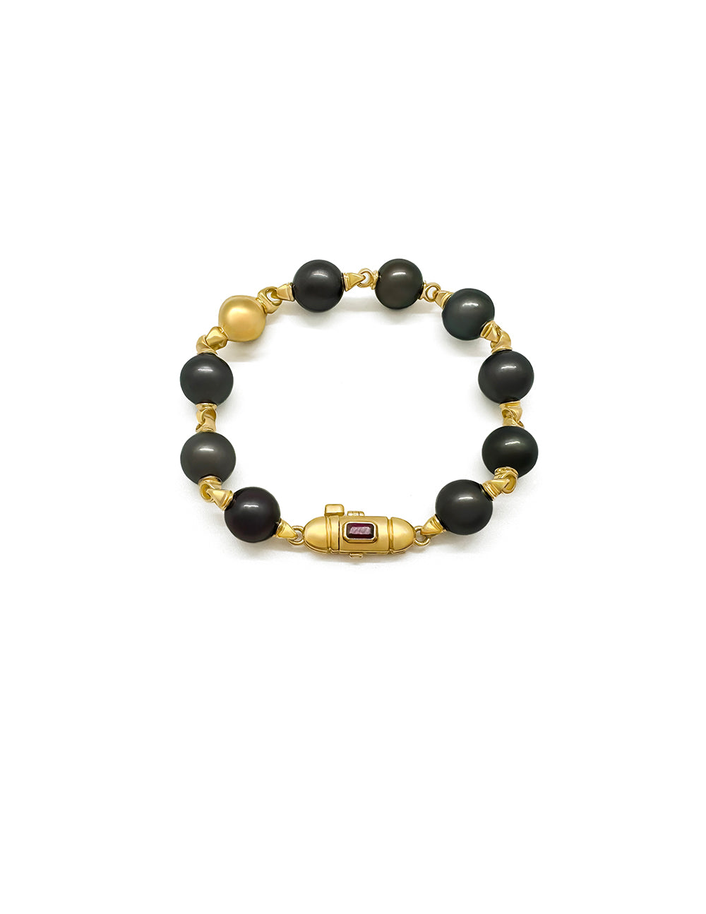 The Emilia Tahitian Pearl Bracelet is a stunning fusion of elegance and opulence featuring a series of lustrous black pearls. The pearls are a a testament to nature's beauty. The clasp, adorned with a vibrant red ruby is a timeless addition to your everyday jewelry collection. The combination of black pearls and gold ensures that it will complement any outfit and make a lasting impression.