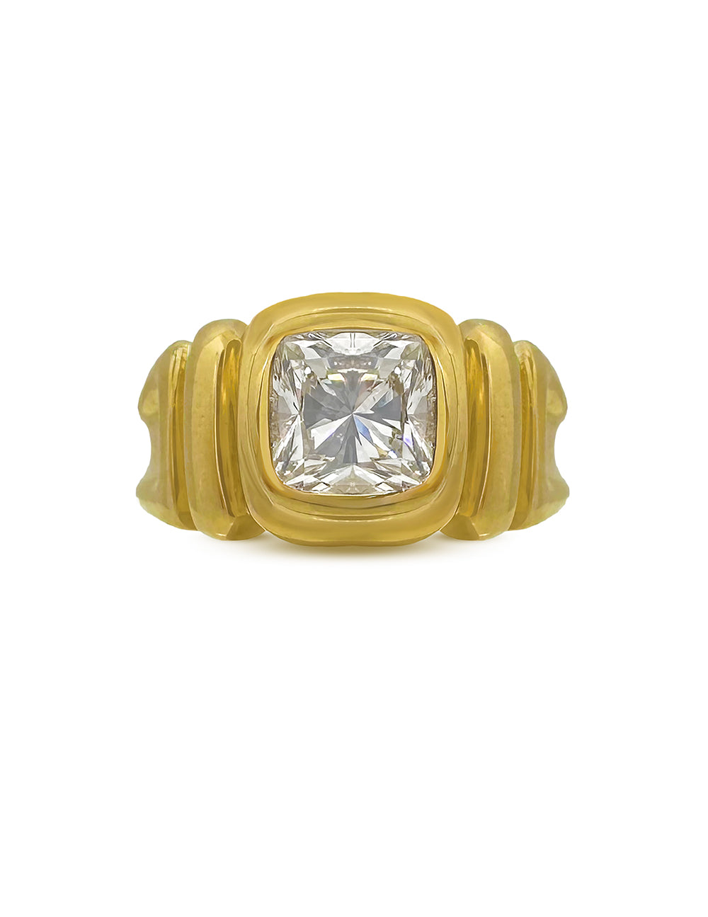 The Hanna Diamond Ring is a gorgeous statement ring featuring a 1ct cushion-cut Diamond. The band is intricately carved, with a waterfall of ridges along the side that cascade around the finger. Every detail was casted and crafted in Los Angeles.