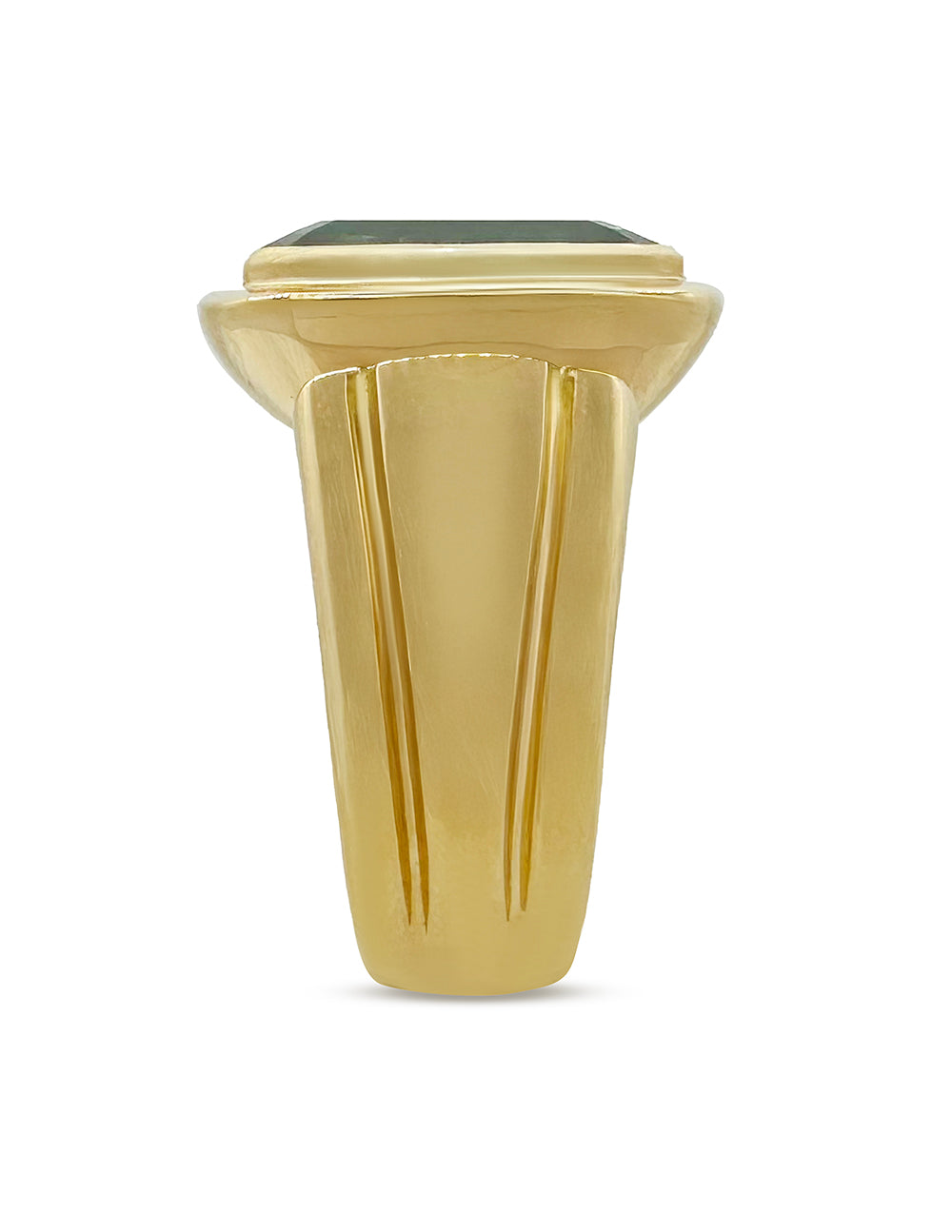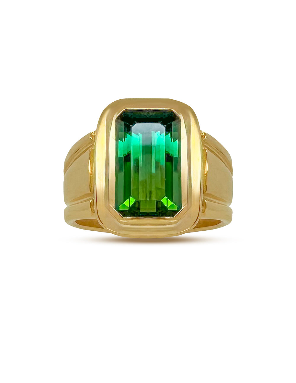 The Loki Tourmaline Ring is a celebration of bold symmetry and rare color. At the center sits an emerald-cut Blue-Green Tourmaline, known for its vibrant energy and grounding properties. Its deep, electric tone draws the eye and anchors the piece with bold intention.