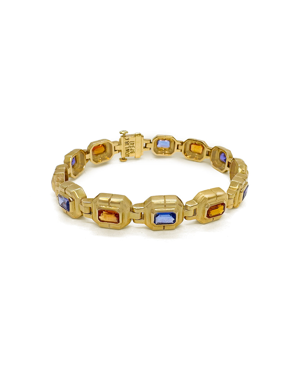 The Lorian Bracelet celebrates contrast through color, texture, and repetition. Each square link is cast with soft, beveled edges and set with alternating Tanzanites and orange Sapphires.This piece moves like armor—structured, bold, and fluid.