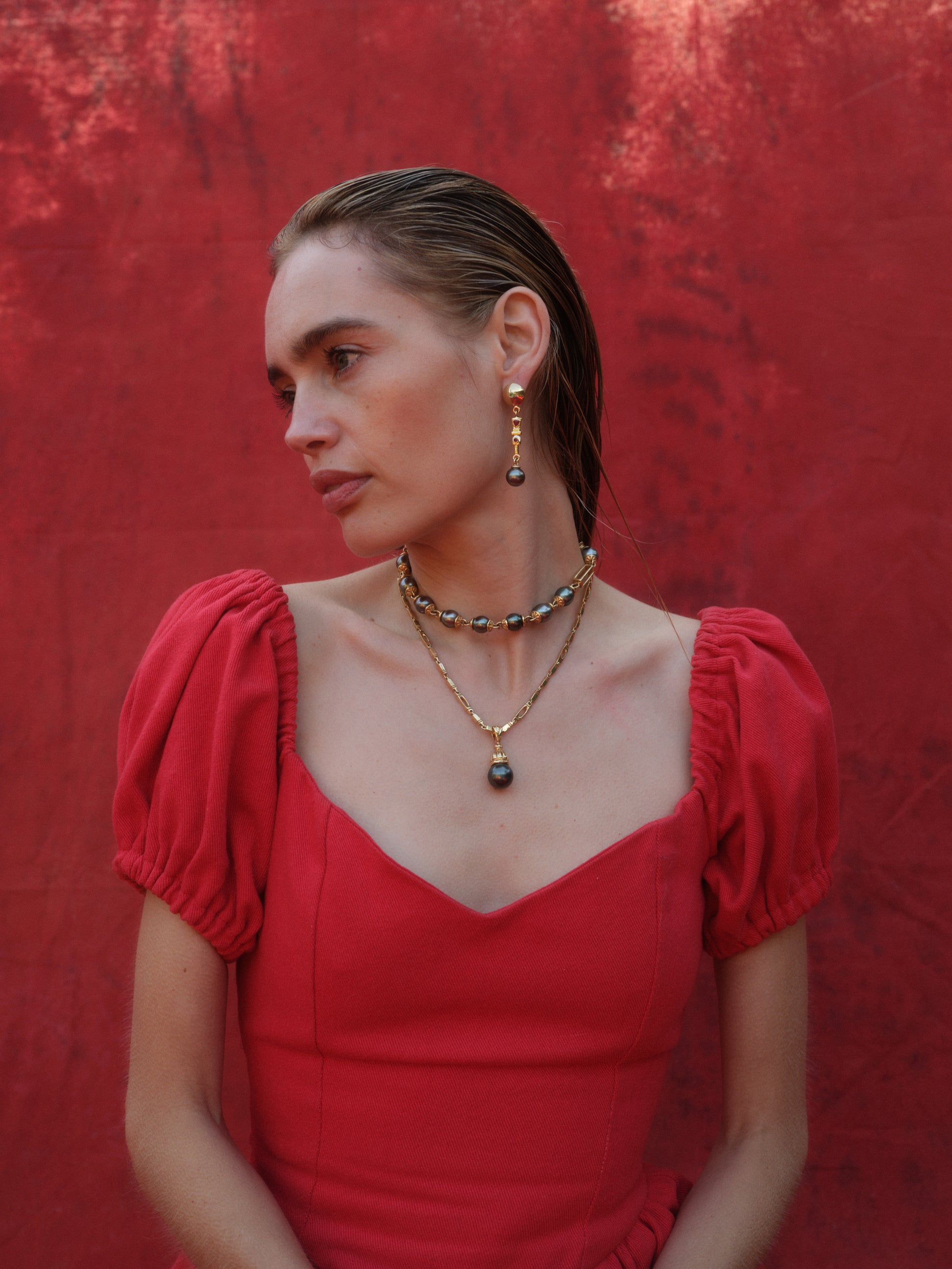The Mae Tahitian Pearl Necklace is a bold statement piece. The chain's intricate pattern adds a touch of elegance and sophistication and adorned with lustrous black Tahitian pearls.