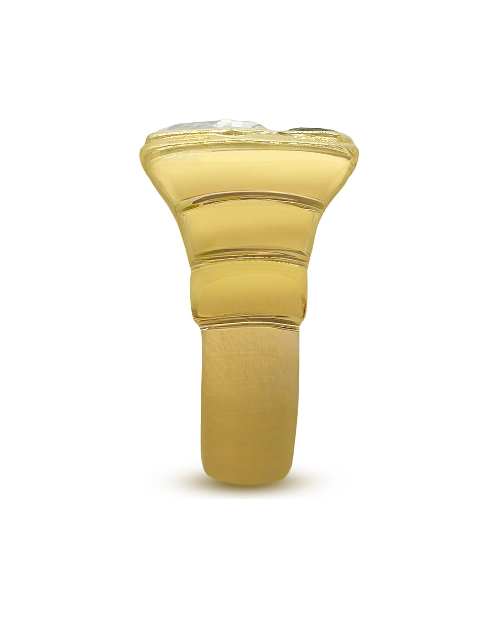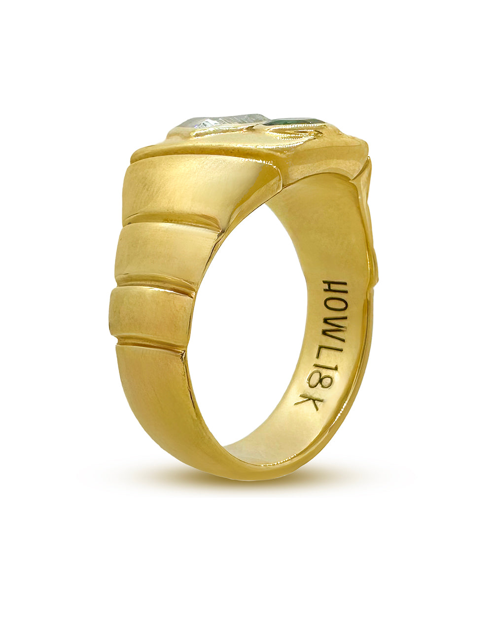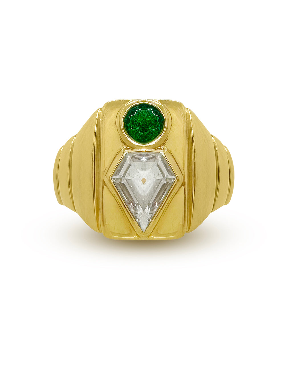 The Moran Diamond Ring highlights bold form and balanced contrast through a clean, architectural silhouette. At the center sits a striking Diamond, anchored by an Emerald.