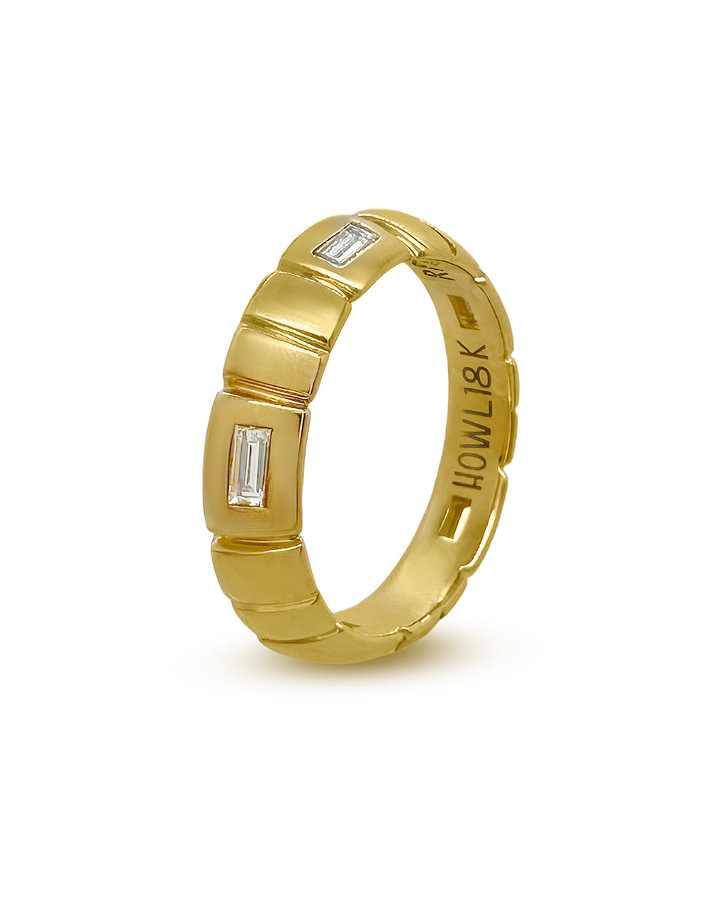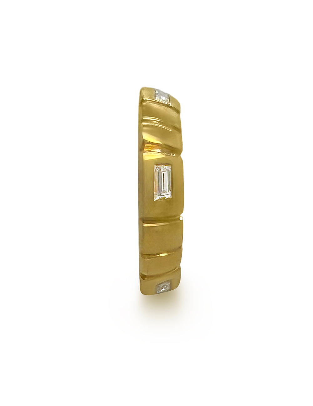 Baguette-cut diamonds—known for their precision and brilliance—are burnish set into the sculpted gold band, reflecting a quiet, confident luxury.