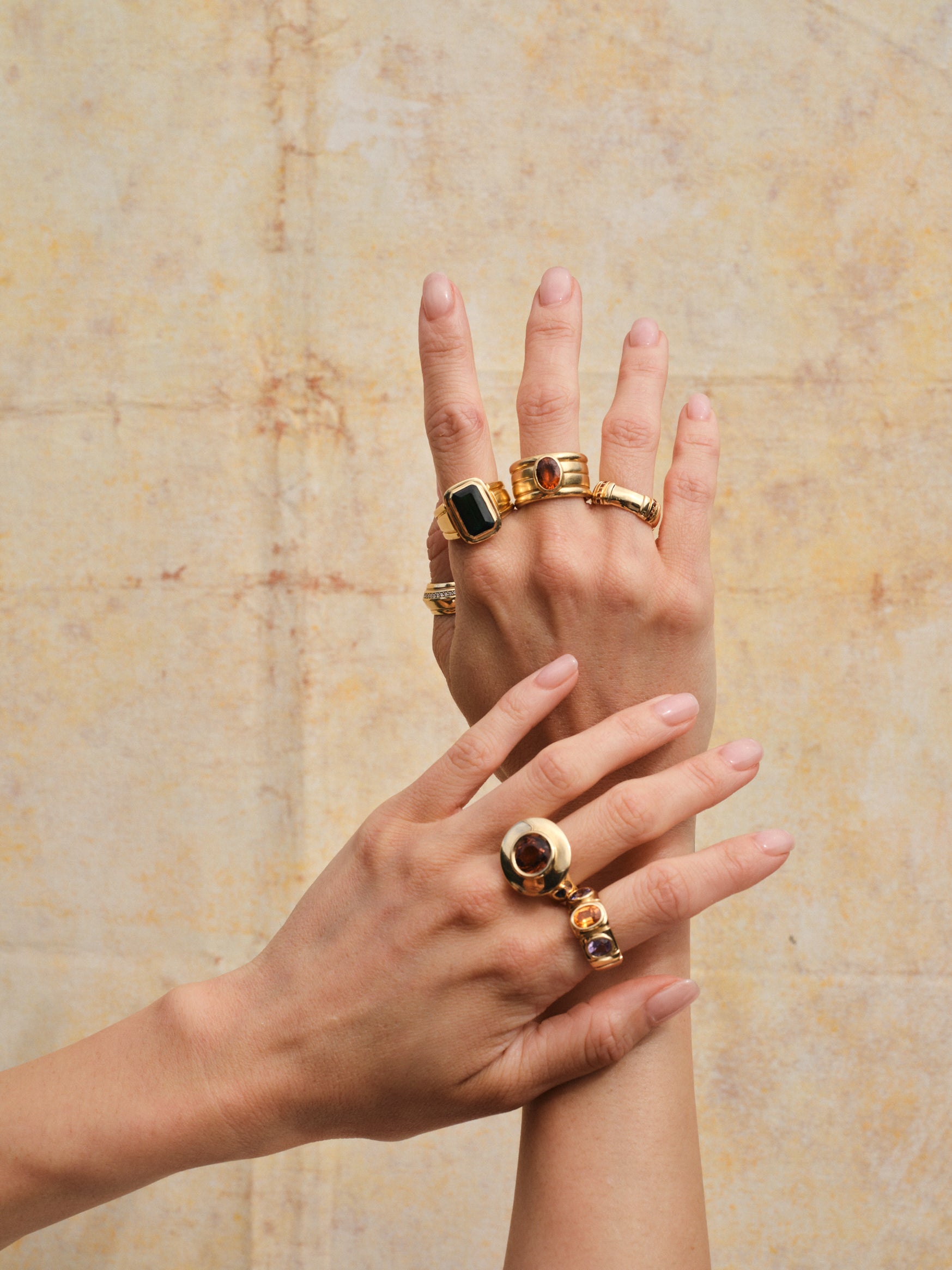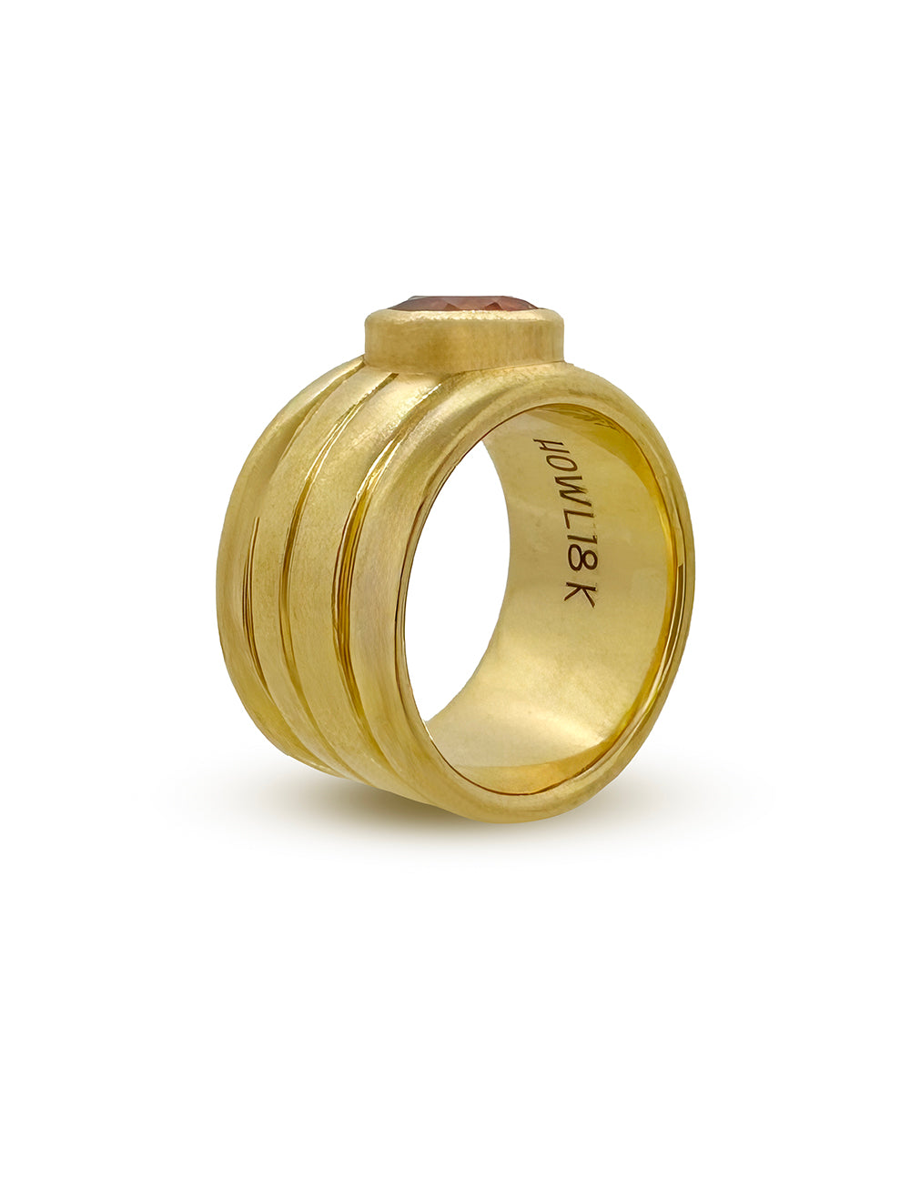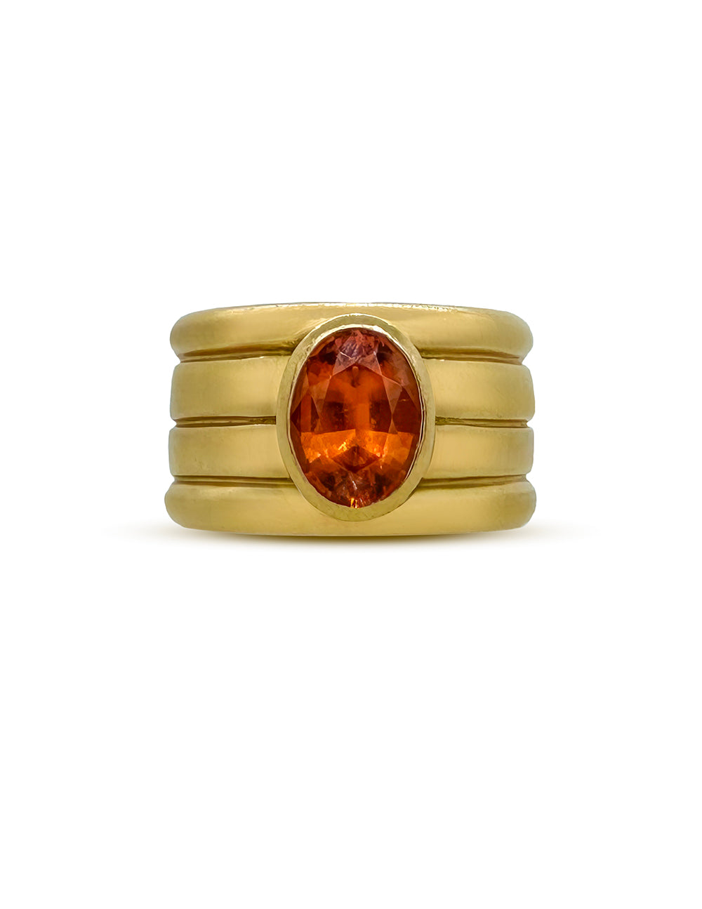The Nomad with Mandarin Garnet radiates warmth and movement. Its vibrant orange center stone glows against a structured, triple-grooved gold band, creating a dynamic play between color and form.