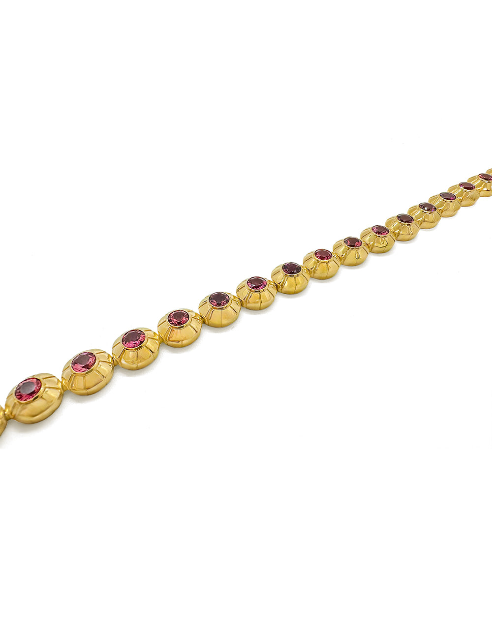 The Obo Bracelet with Pink Tourmalines offers playful symmetry and joyful color. Each circular link is bezel set with a vibrant pink Tourmaline.