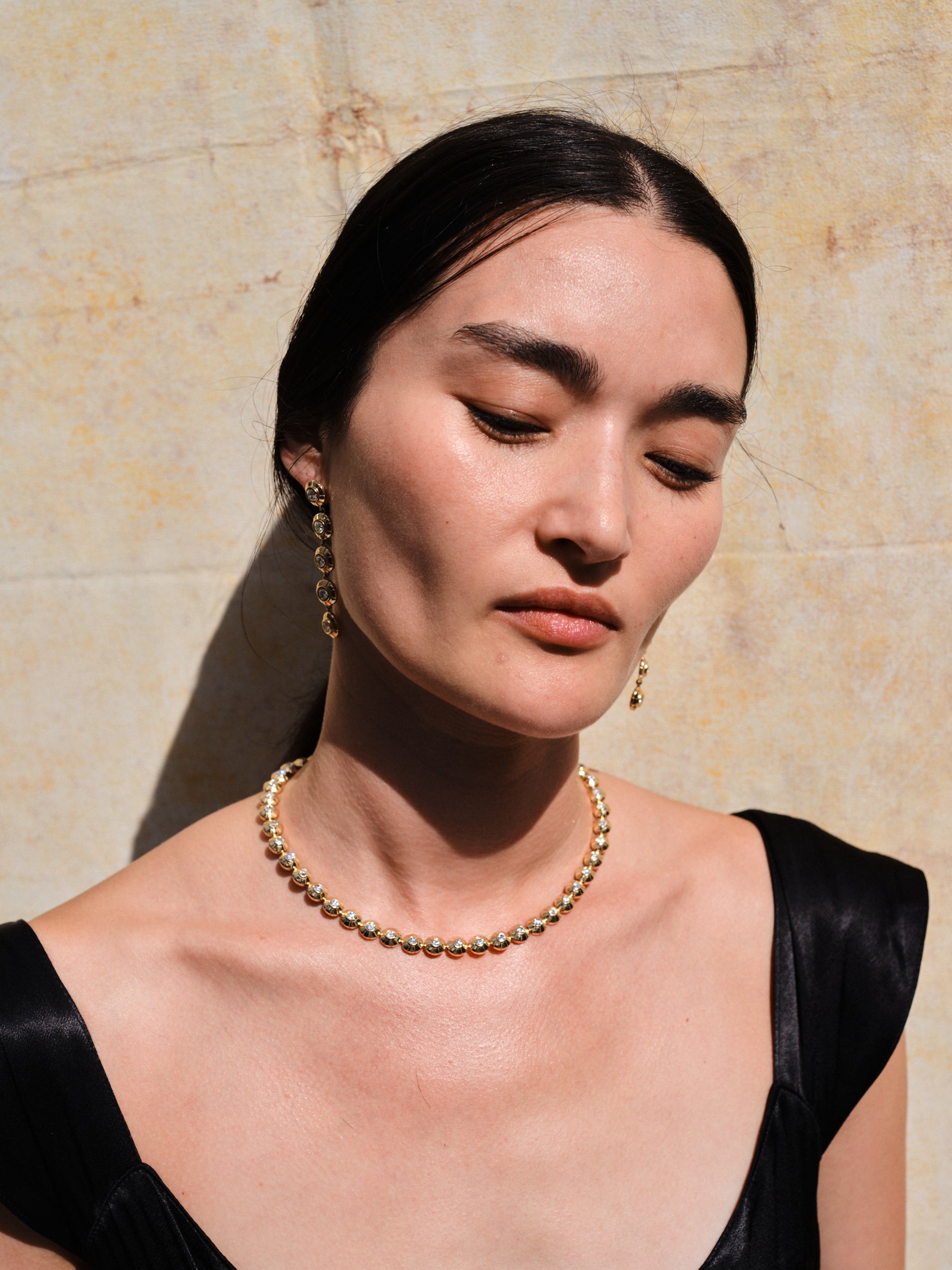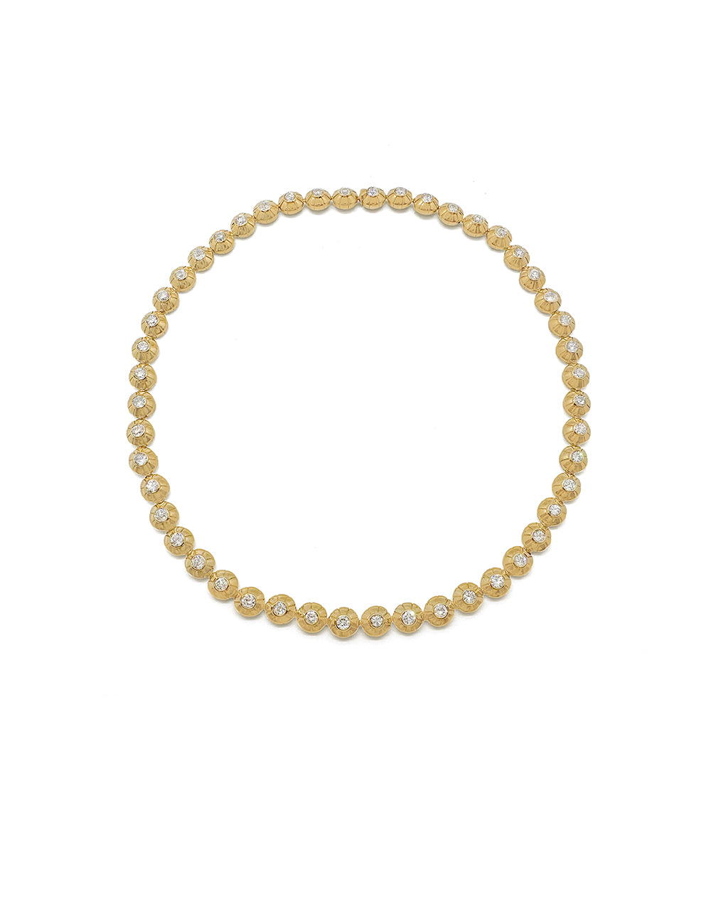 The Obo Necklace with old Euro Cut Diamonds brings together rhythm, light, and refinement. Each gold link features a bezel-set Diamond, forming a continuous pattern of brilliance that circles the neck like a halo.