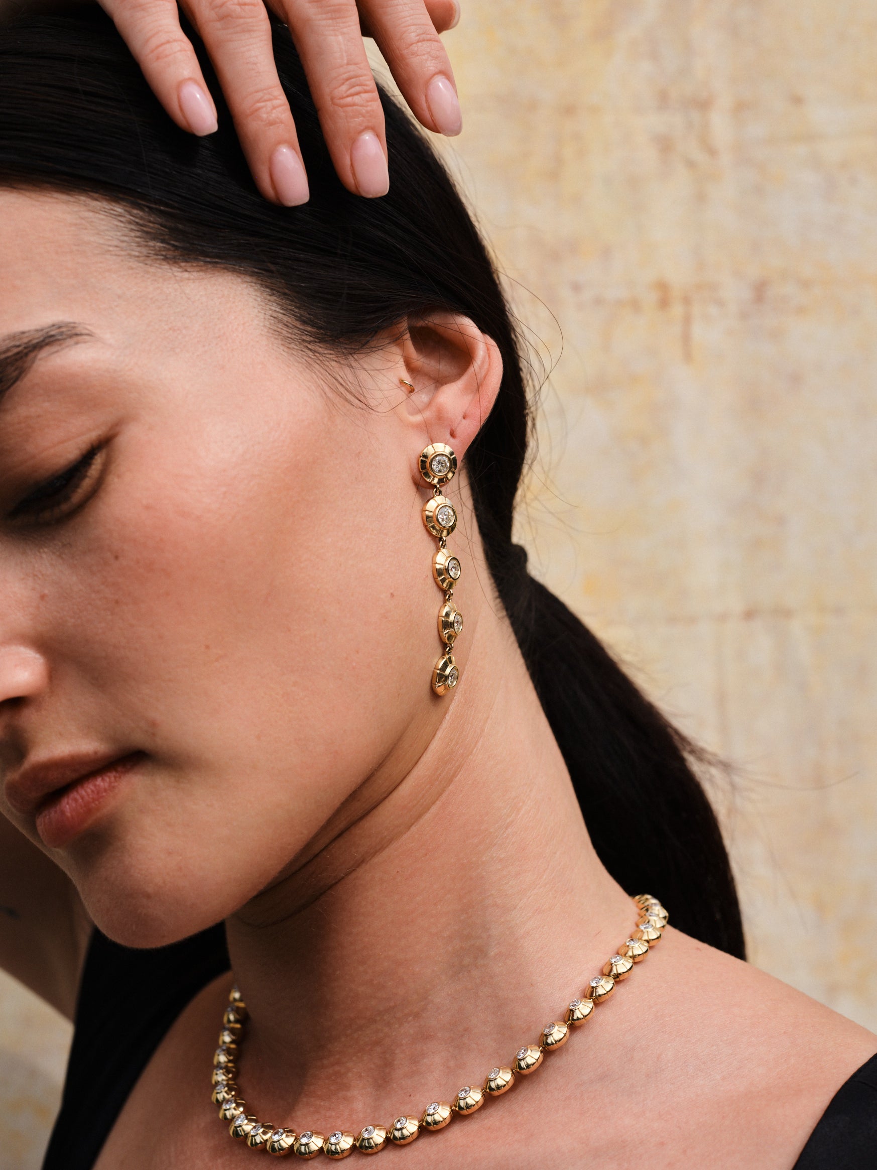 Diamonds are nestled into rounded settings that feel both modern and organic. Designed and cast in Los Angeles, this piece offers quiet opulence and timeless precision.