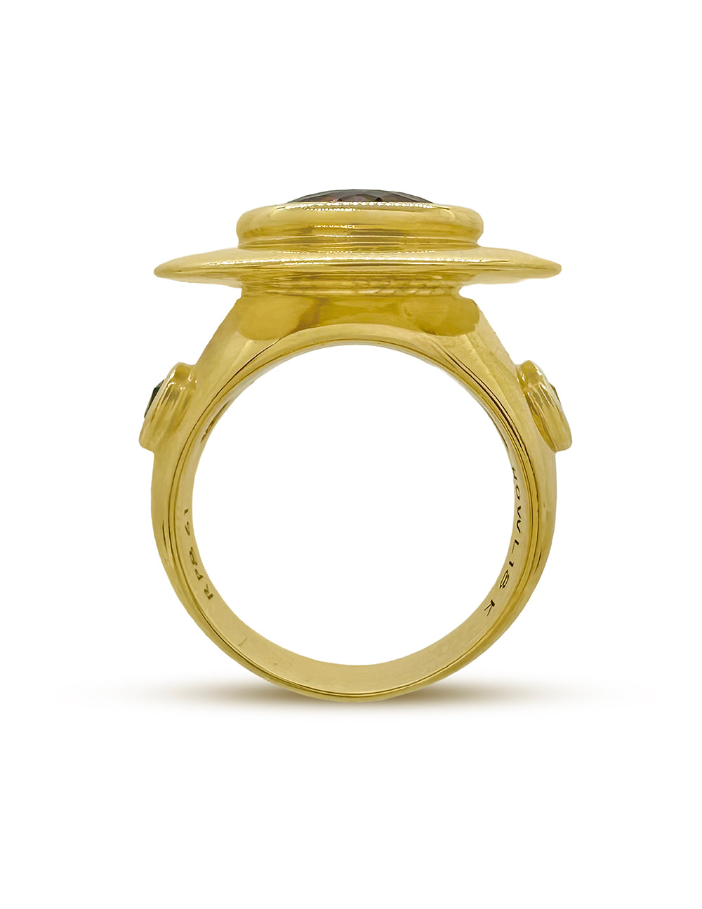Featuring a bold, bezel set pink Tourmaline at its center, the design radiates outward with a wide, sculptural disc that feels celestial.