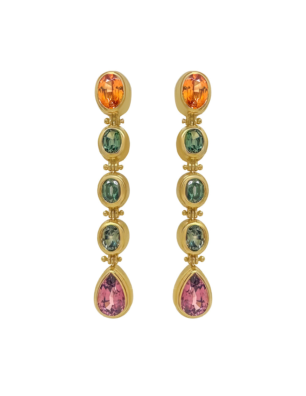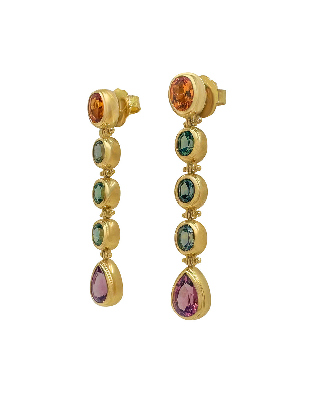 SARARA 5 DROP EARRINGS - MANDARIN GARNET, UNHEATED TEAL SAPPHIRE, AND MALAYA GARNET